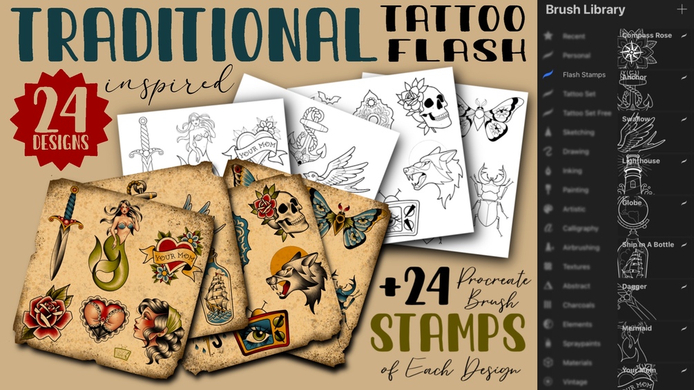 - 24 procreate brush stamps. A brush/stamp of each design. To change the size of one of the stamps all you have to do is increase or decrease the size of the brush. Ideal for easily getting the size of a design perfect for a client, ready to stencil and tattoo.